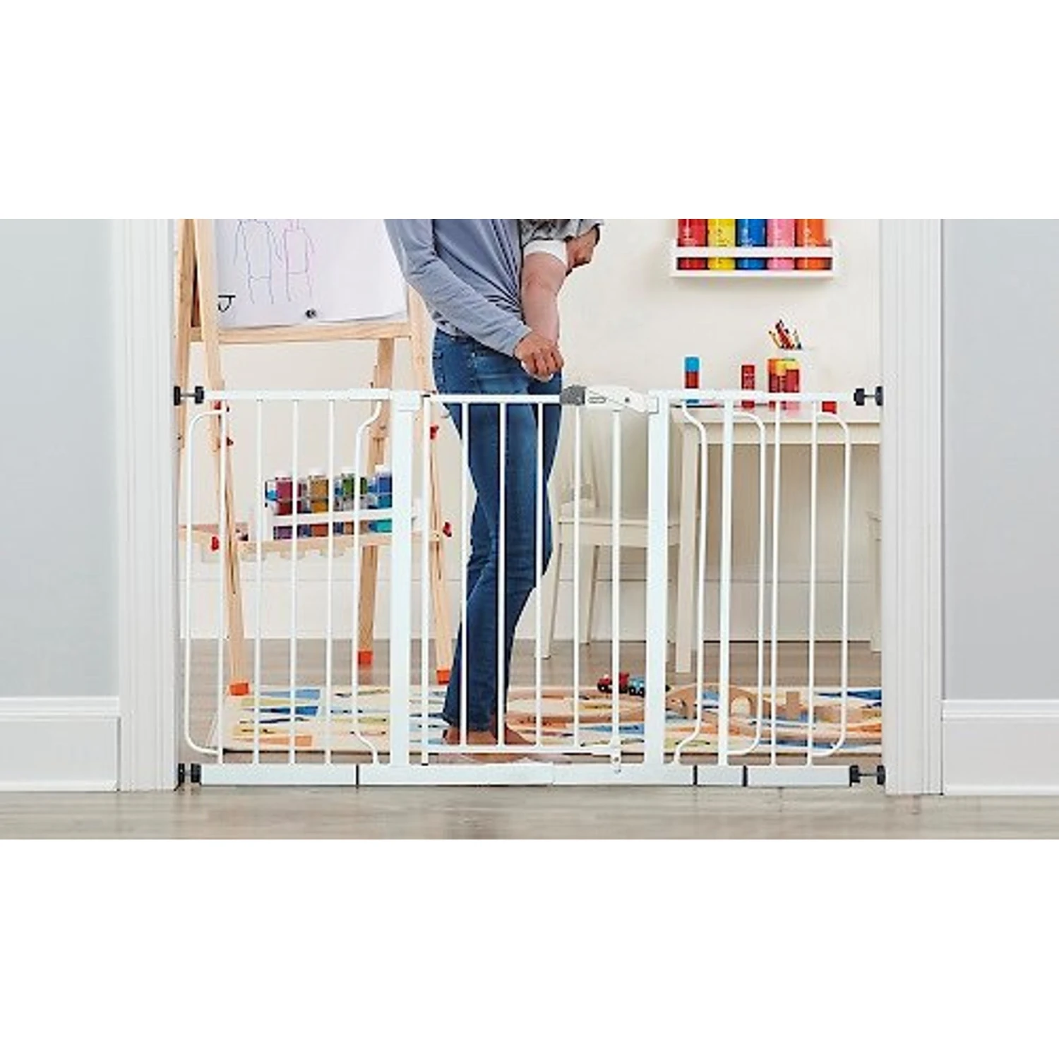 - Features a convenient walk-through design with a one-touch release safety lock.