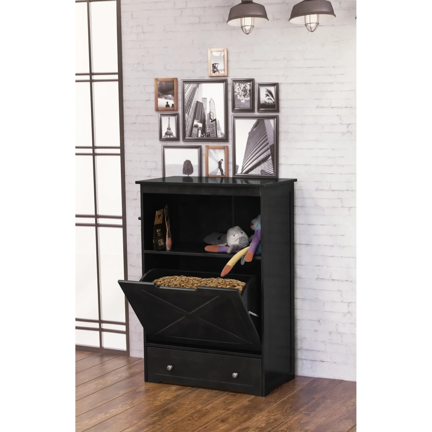 - Large hinged storage area holds up to 107 cups of dry food.